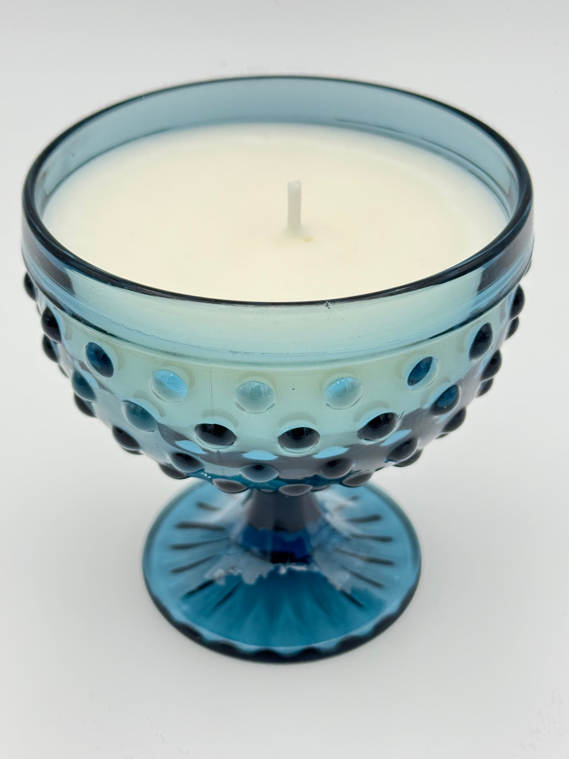 Teal-blue hobnail bubble glass compote – Vintage pressed glass with raised hobnails.