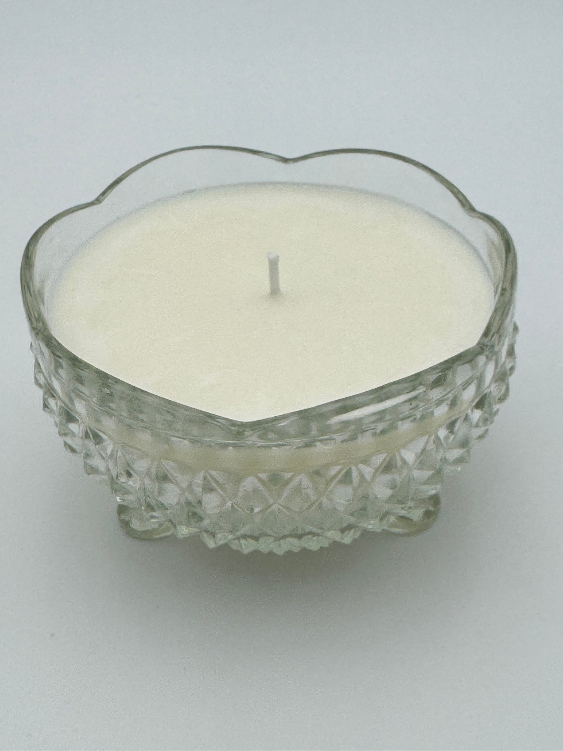 Clear pressed glass footed candy dish (diamond-cut pattern; 3 small feet, scalloped rim) – Vintage pressed glass trinket/candy bowl.