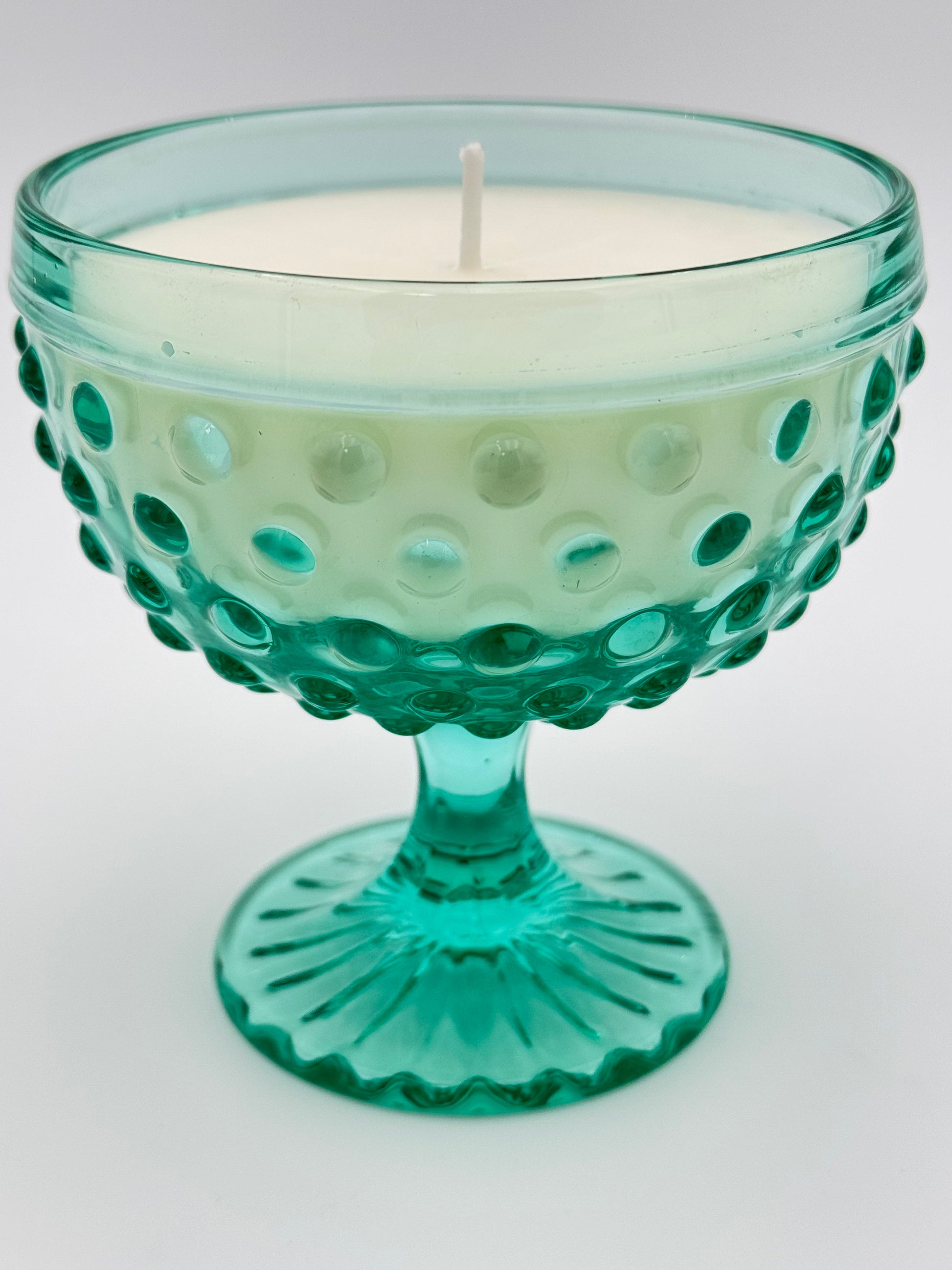 Aqua/teal hobnail bubble pedestal bowl – mid-century style compote with large raised “bubble” pattern. Wax-filled.