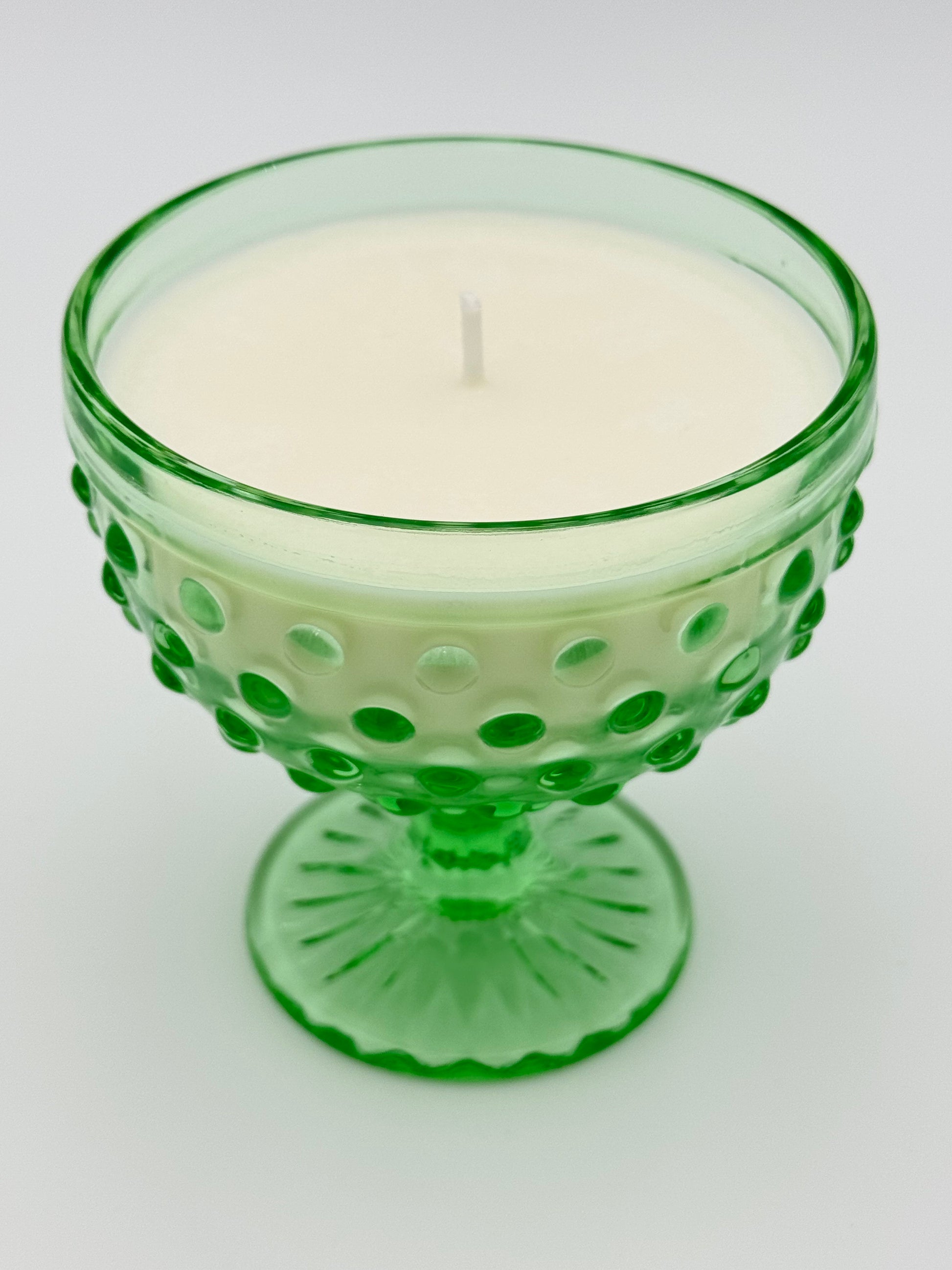 Emerald-green hobnail bubble compote – footed bowl with round “bubble” motif, filled candle.